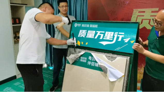 由質量監督員鋪貼完成的瓷磚樣板與留樣封存樣品將送抵“粵固質量萬里行”清遠站會場,在全場經銷商、渠道商、裝企、建材從業者、瓦工師傅的共見證下,現場觀摩暴力打砸測試,體驗粵固產品卓越品質,感受粵固產品過硬實力!